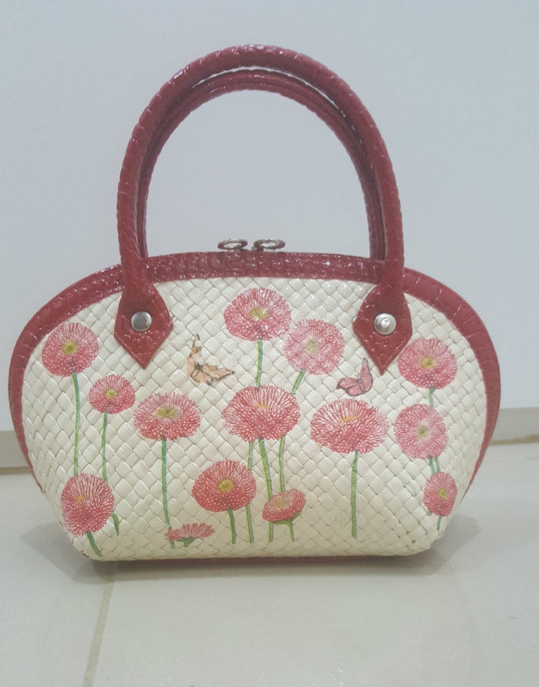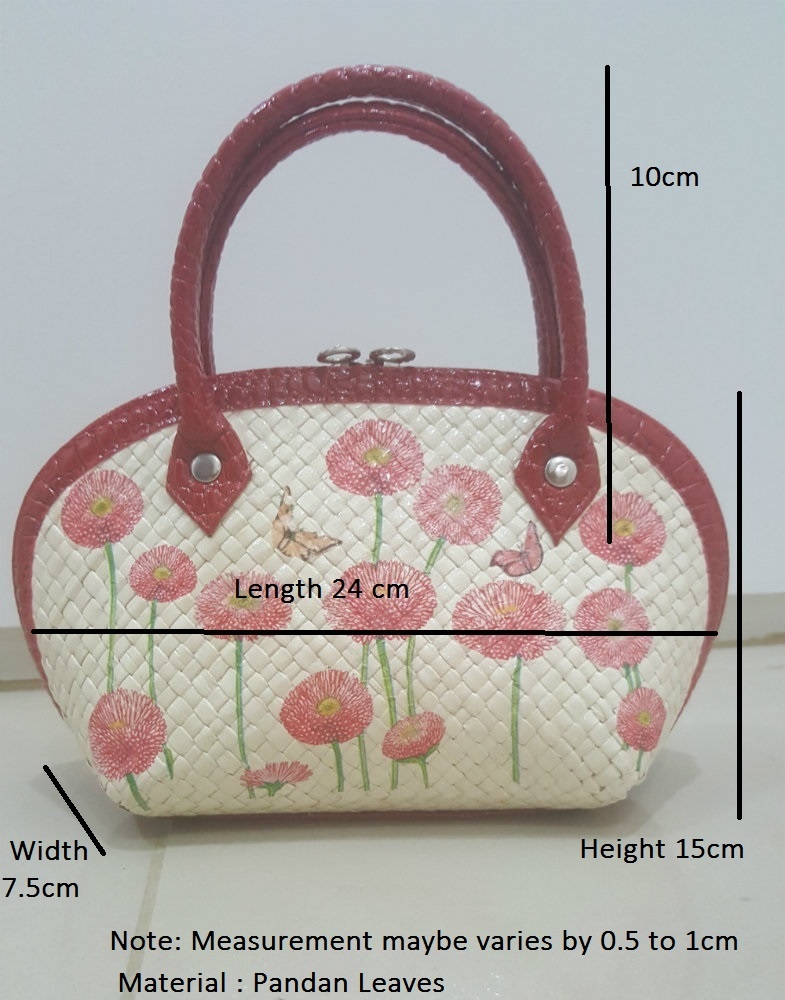 Tote Bag Floral Red Handmade Pandan Leaves, Floral pattern handdrawn Material : Pandan Leave Suitable for any occassion Weight : Light